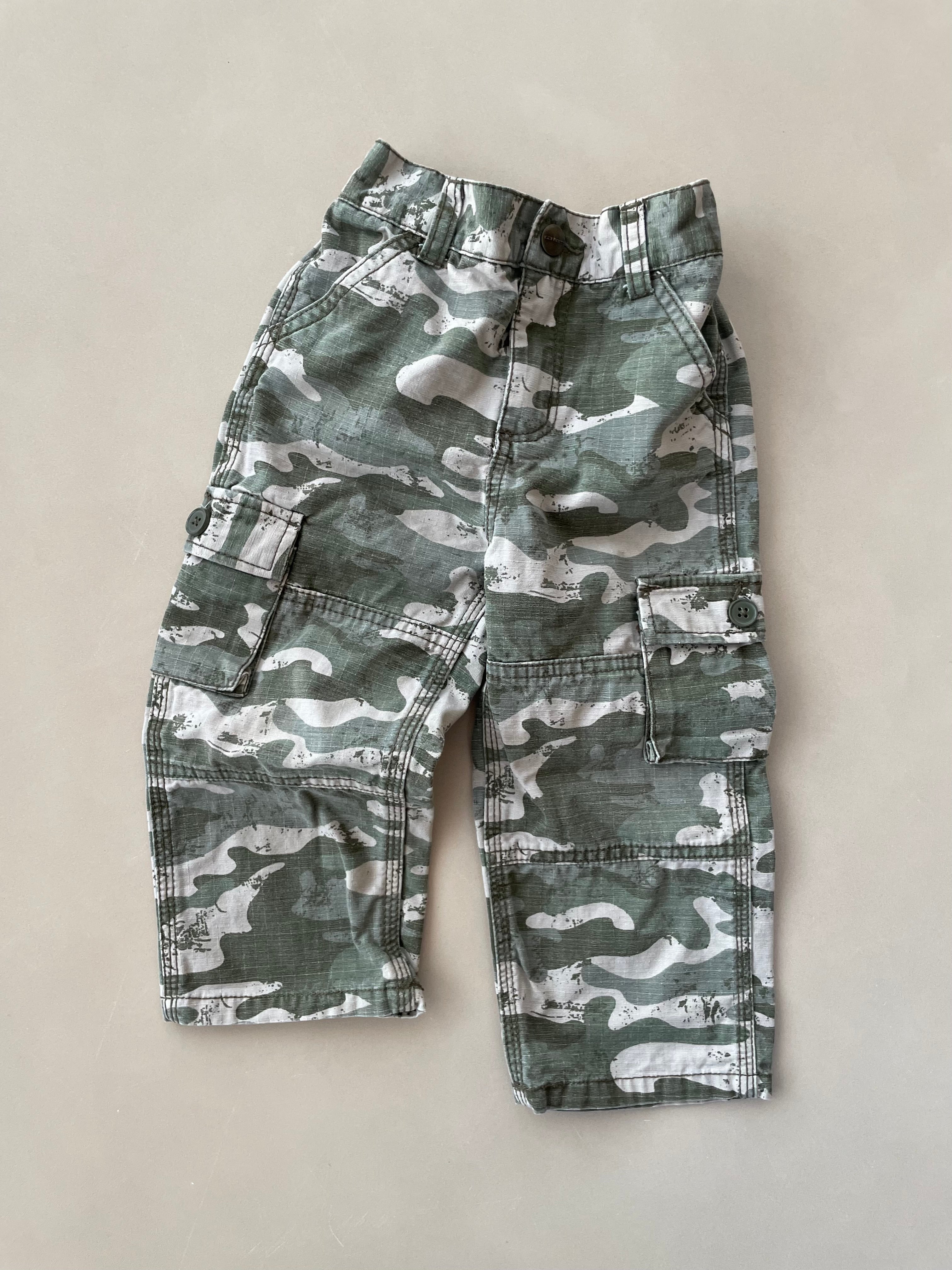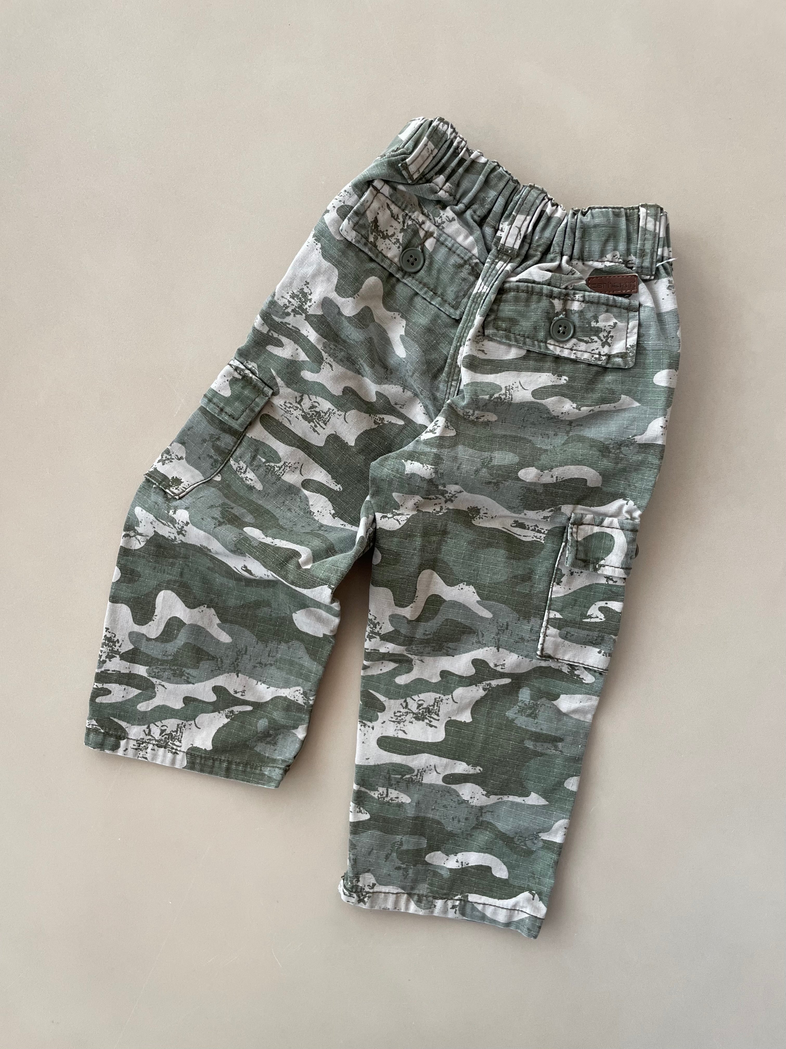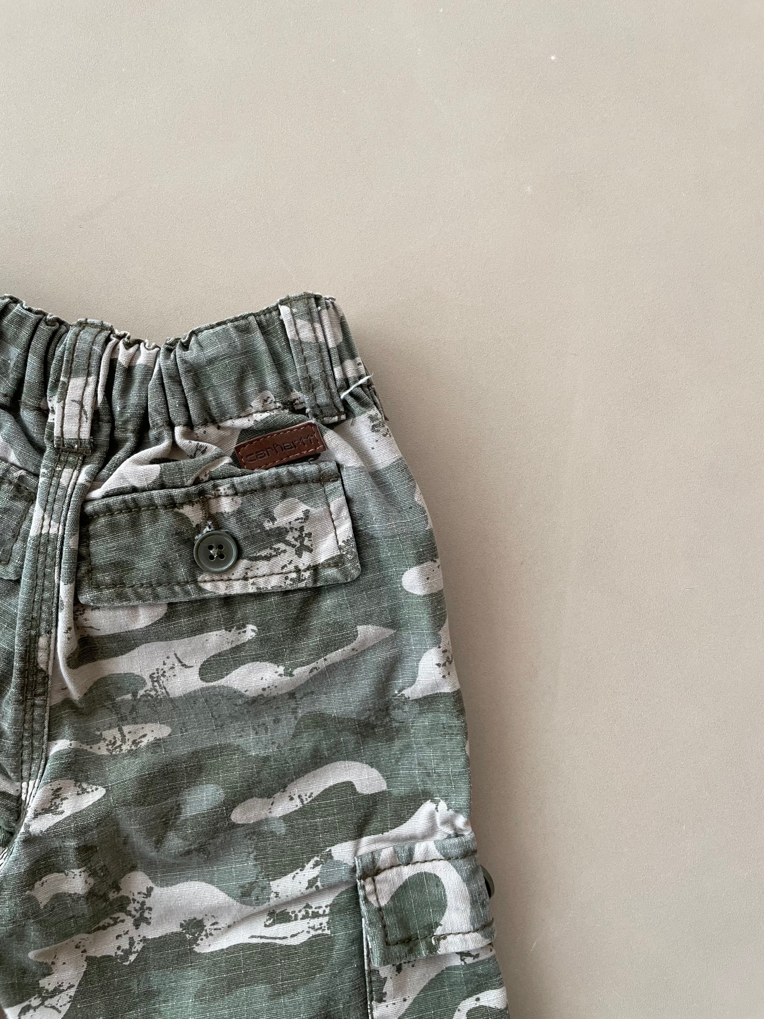 Cool pair of Carhartt cargo pants in camo print. With elastic waist, snap button and Carhartt logo on back.