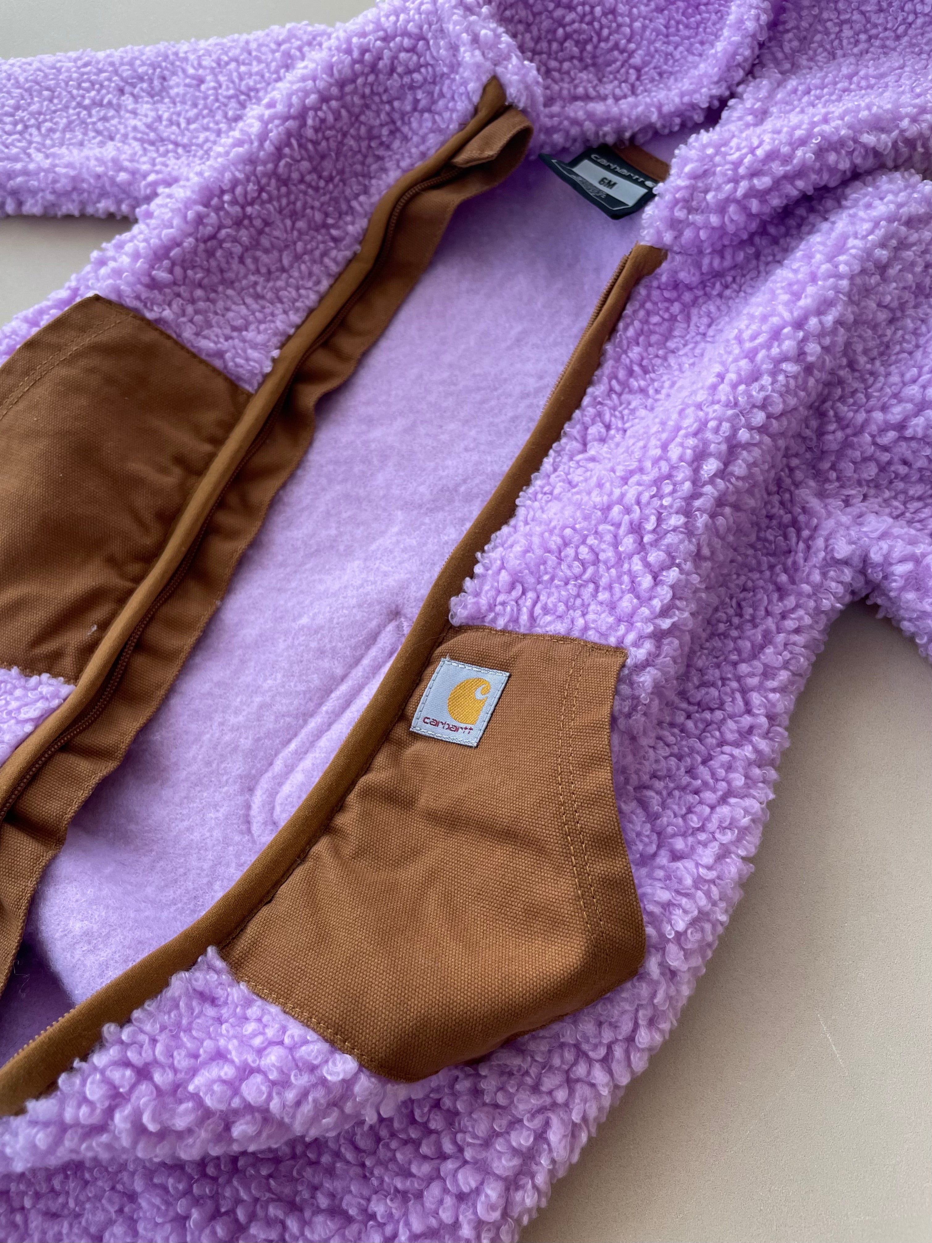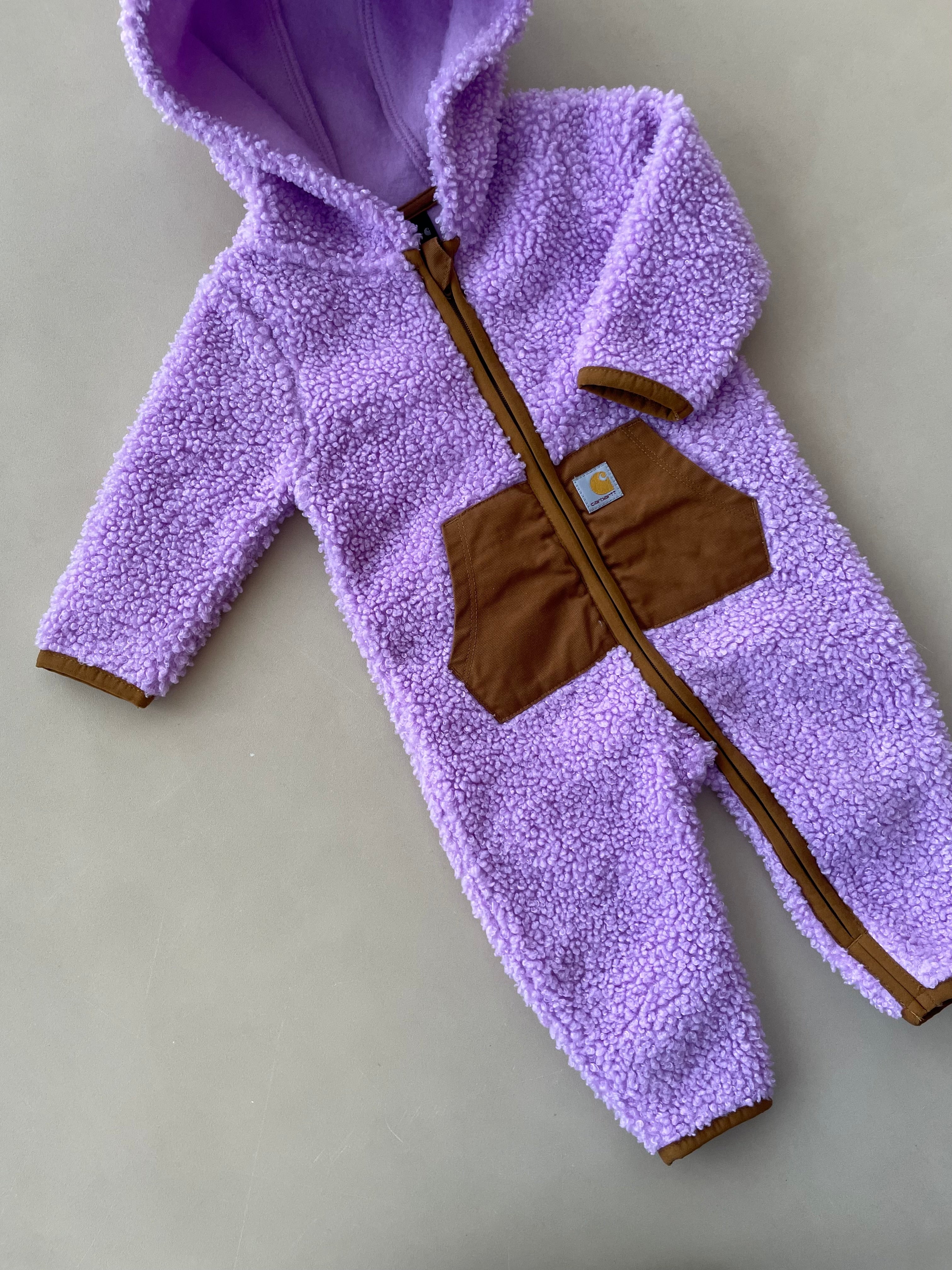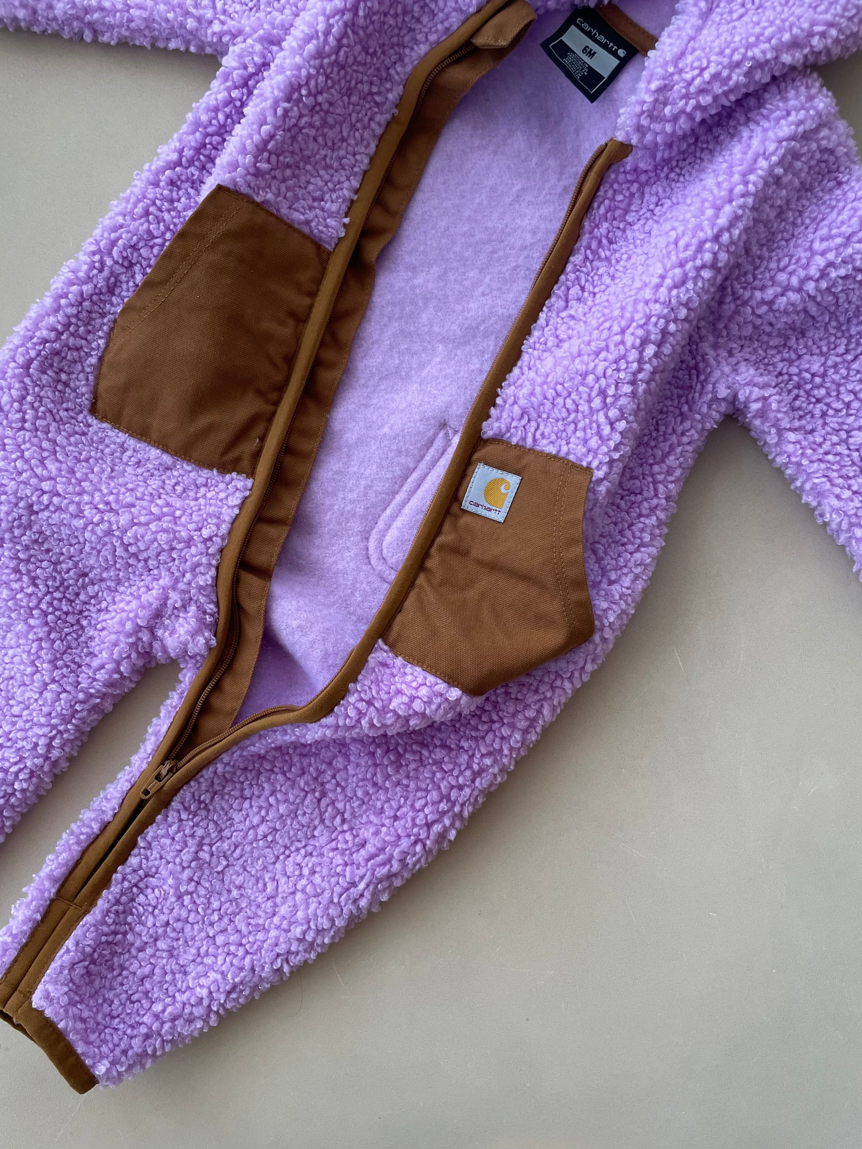 Cozy and warm hooded suit from Carhartt, with a long diagonal zipper for easy access. It has Carhartt branding on front.