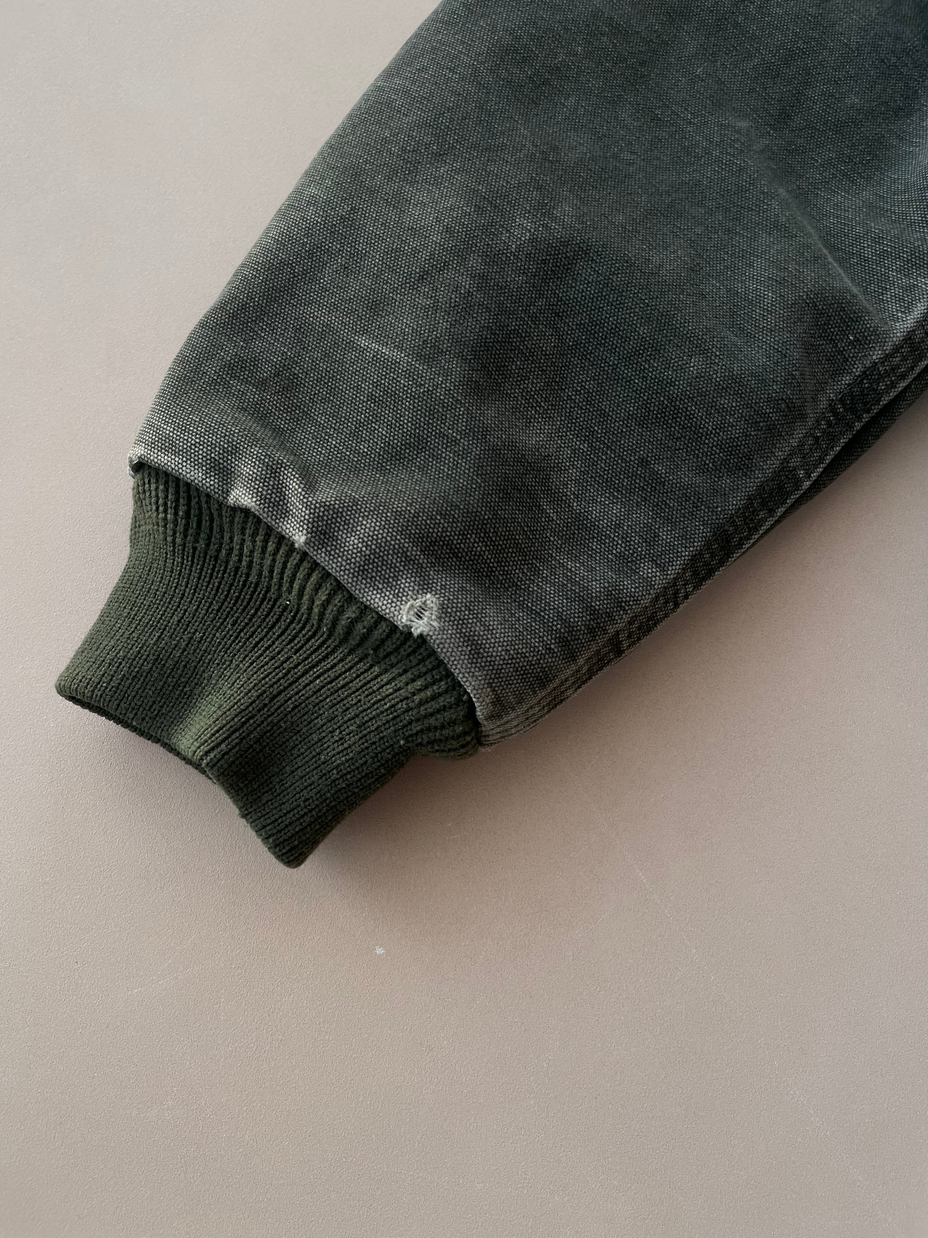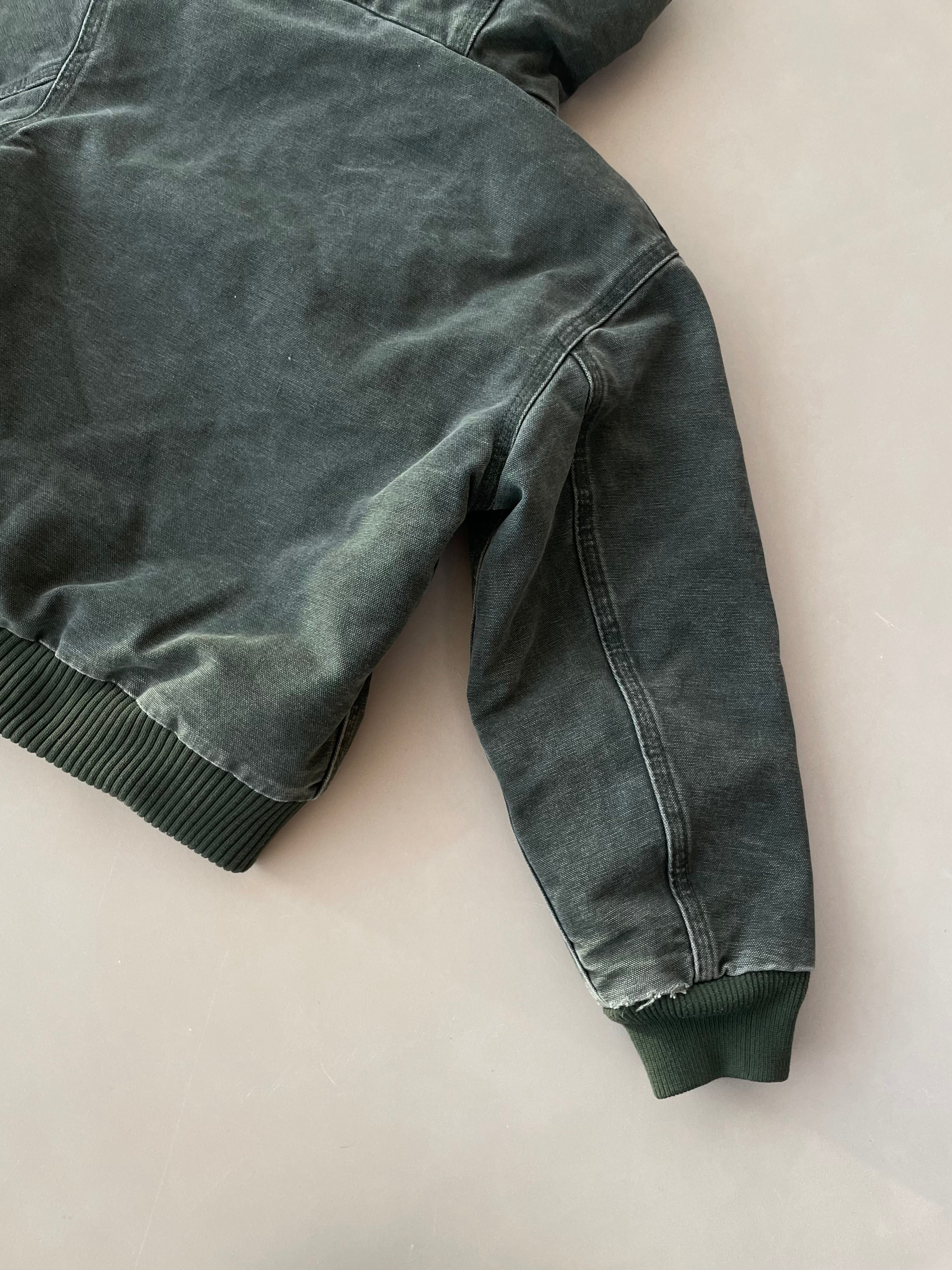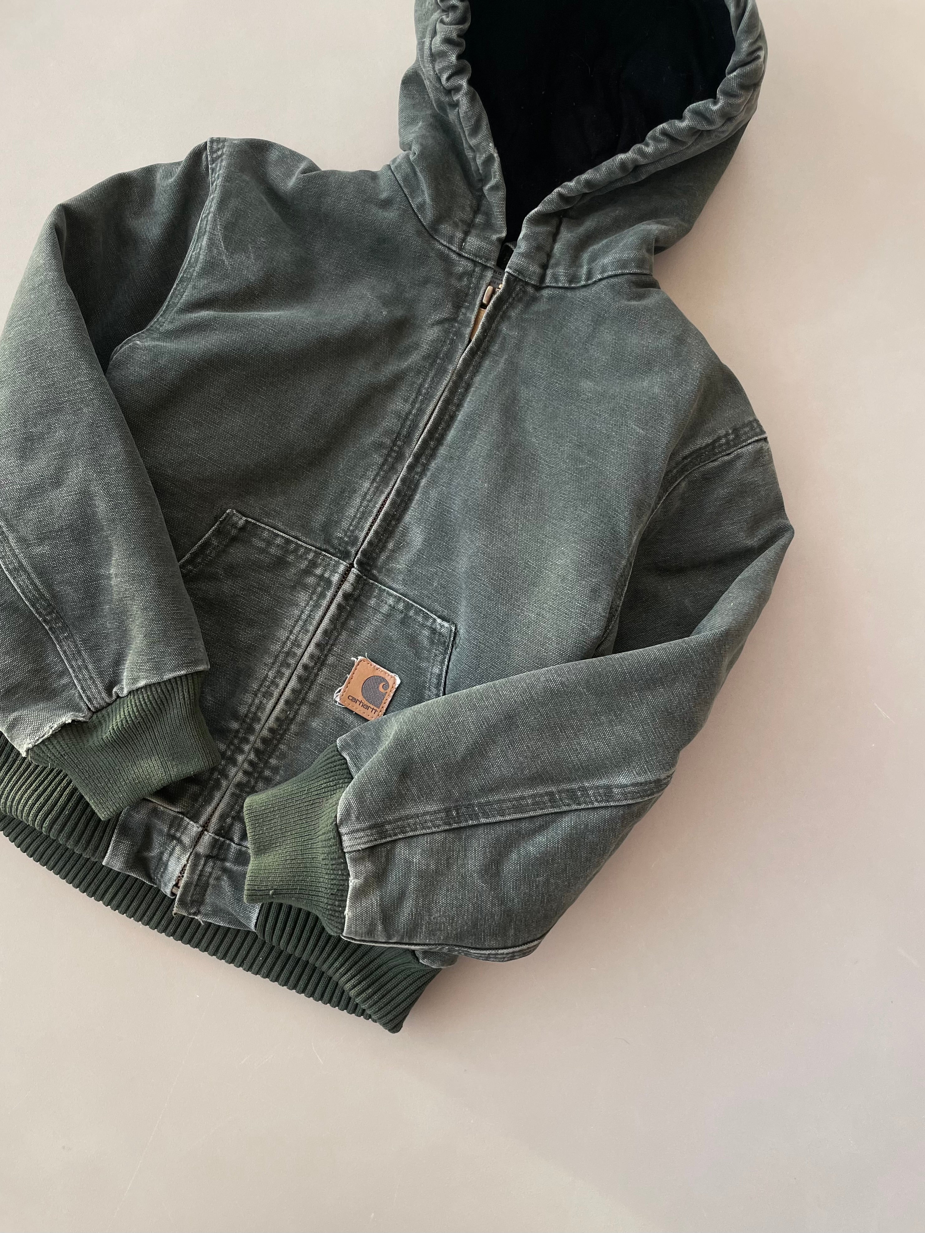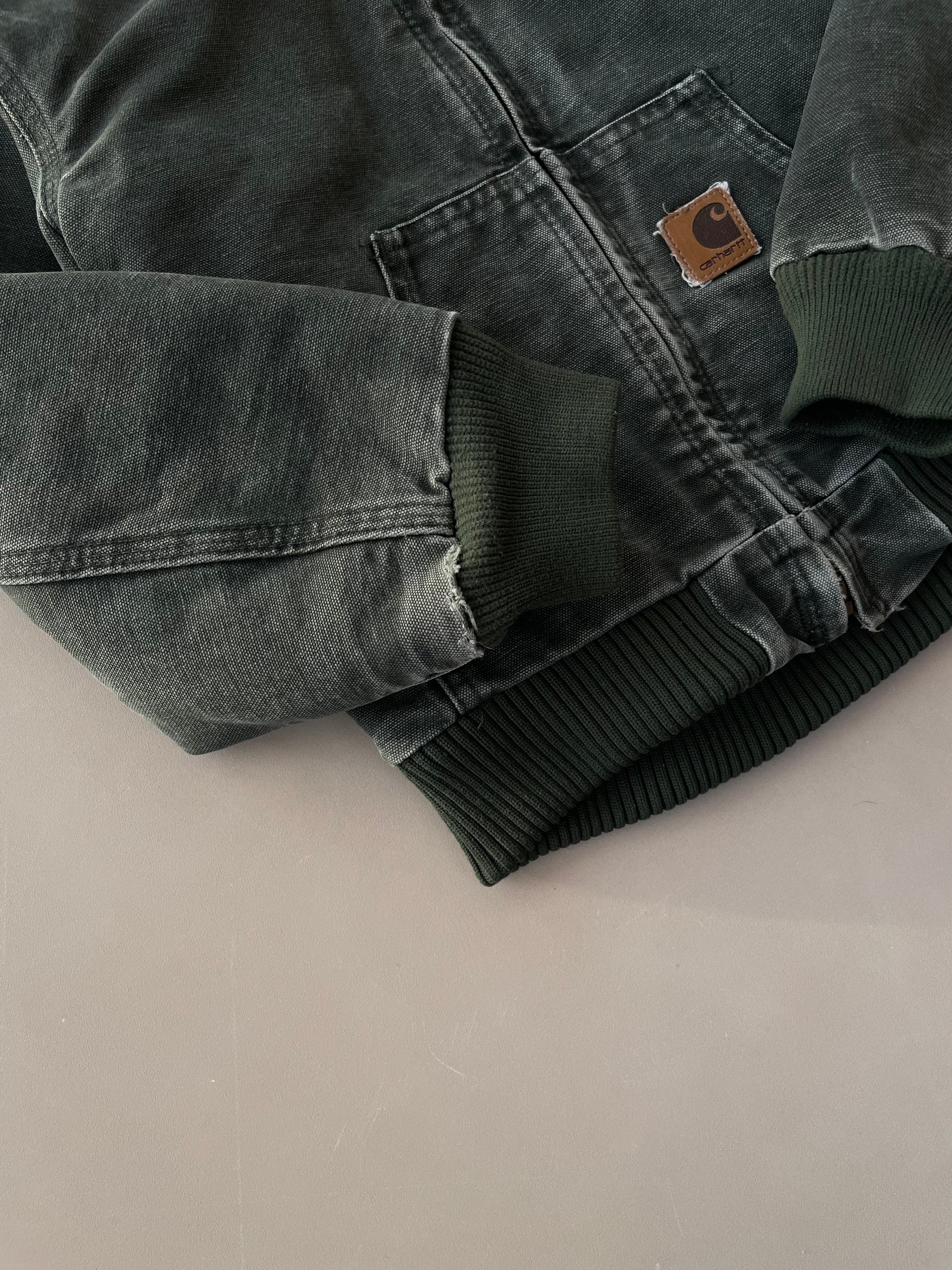 Classic vintage workwear hooded jacket from Carhartt, in the durable canvas material. It's lined with a soft quilted material and it has logo in front. With ribbed cuffs and waist.
