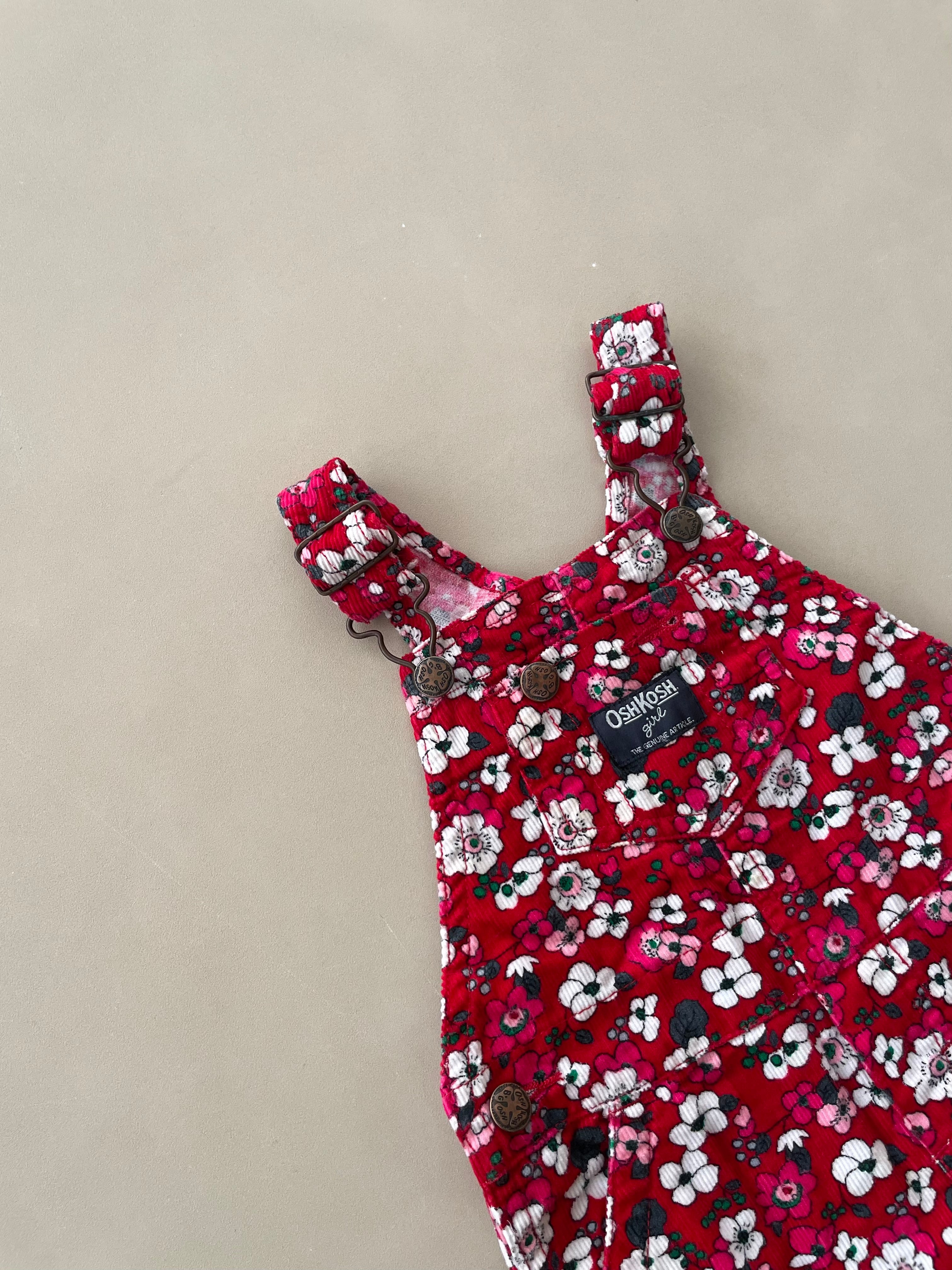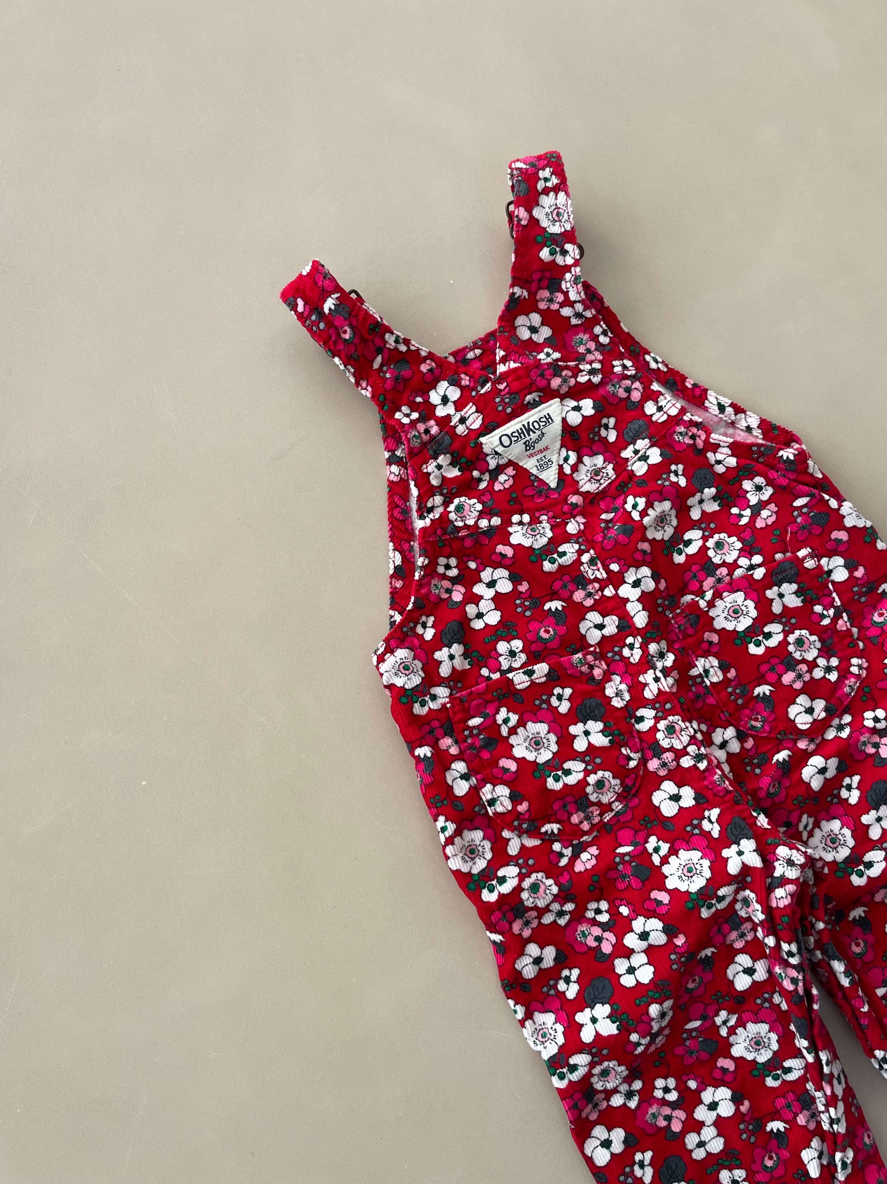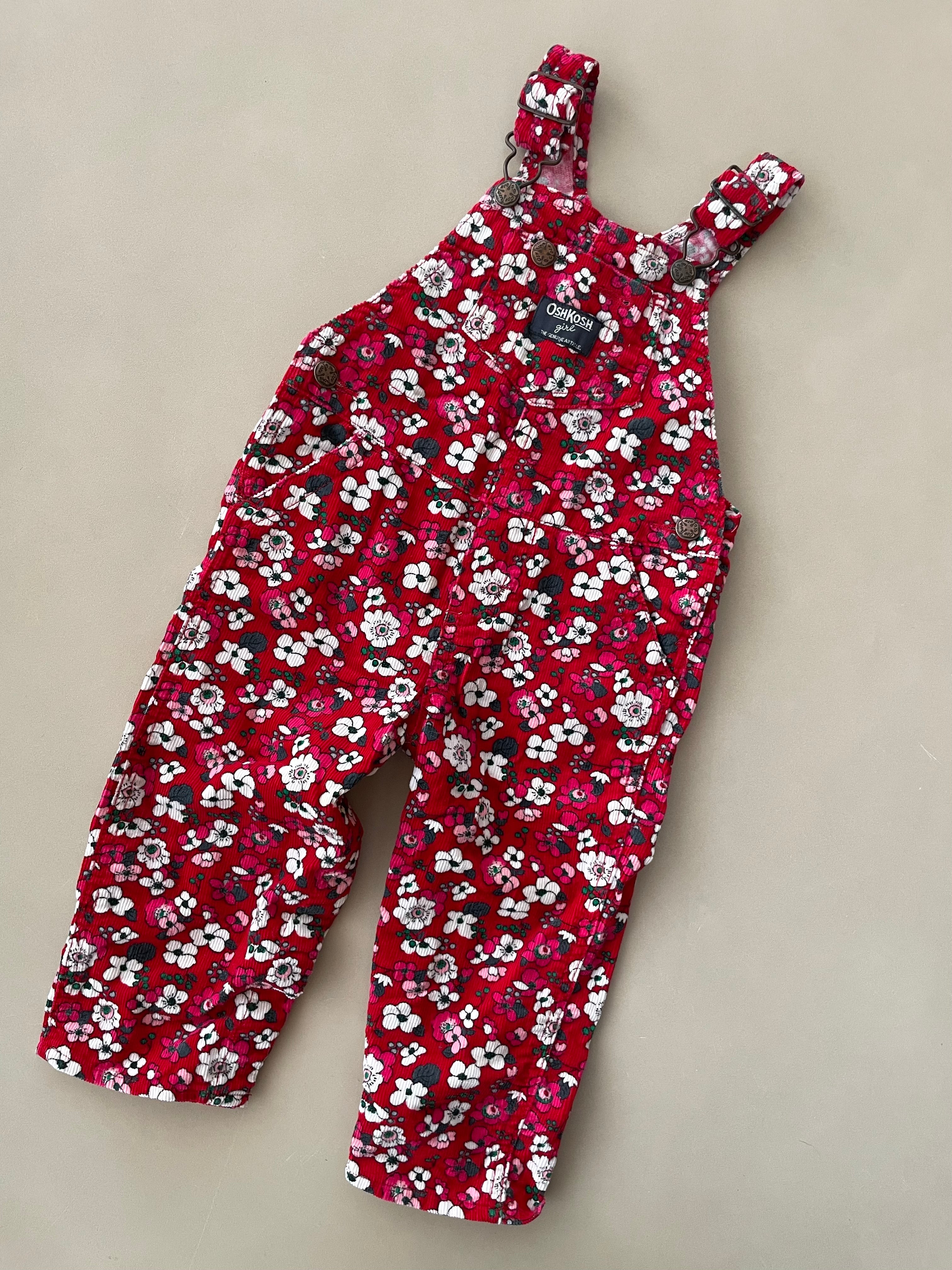 A beautiful pair of corduroy overalls from Oshkosh in a floral print, with Oshkosh branding in front and back.