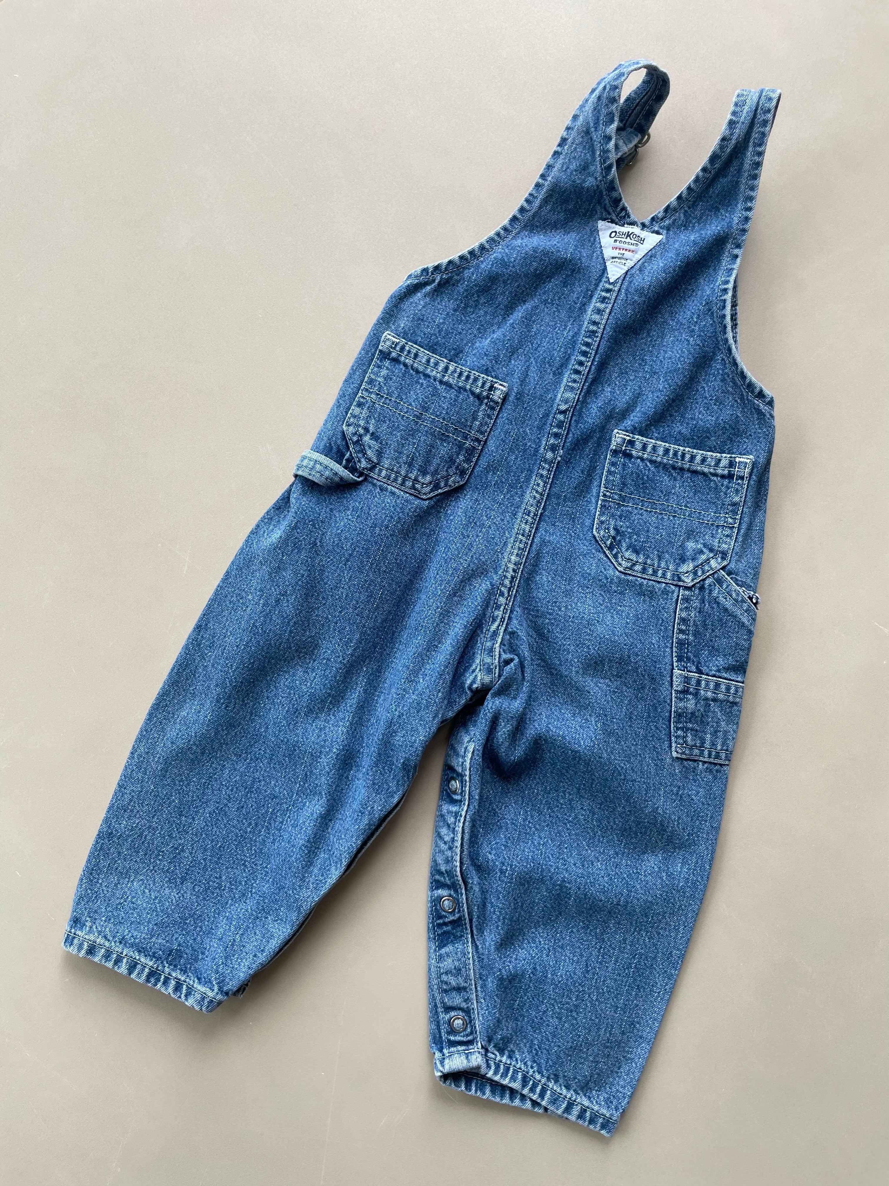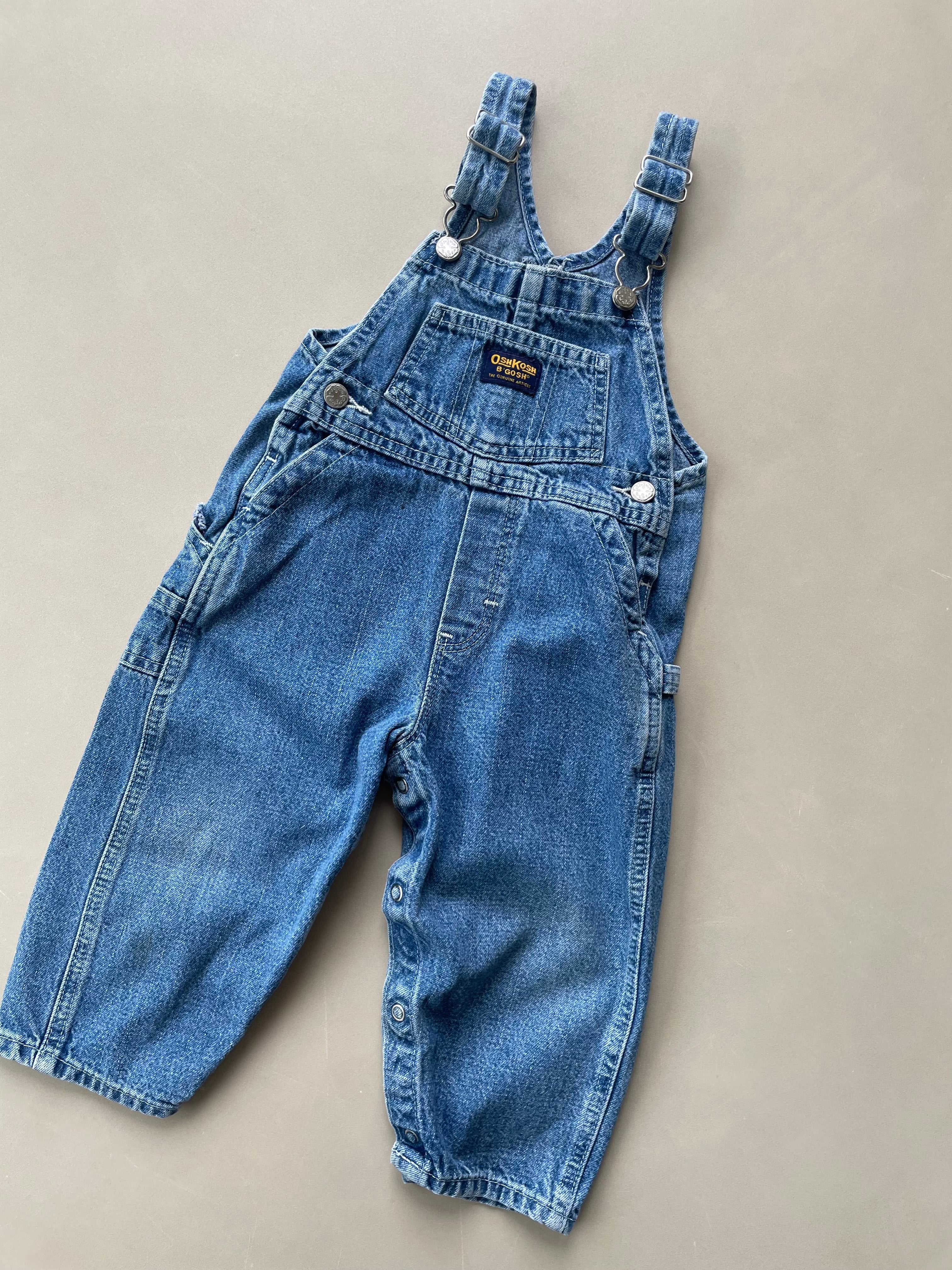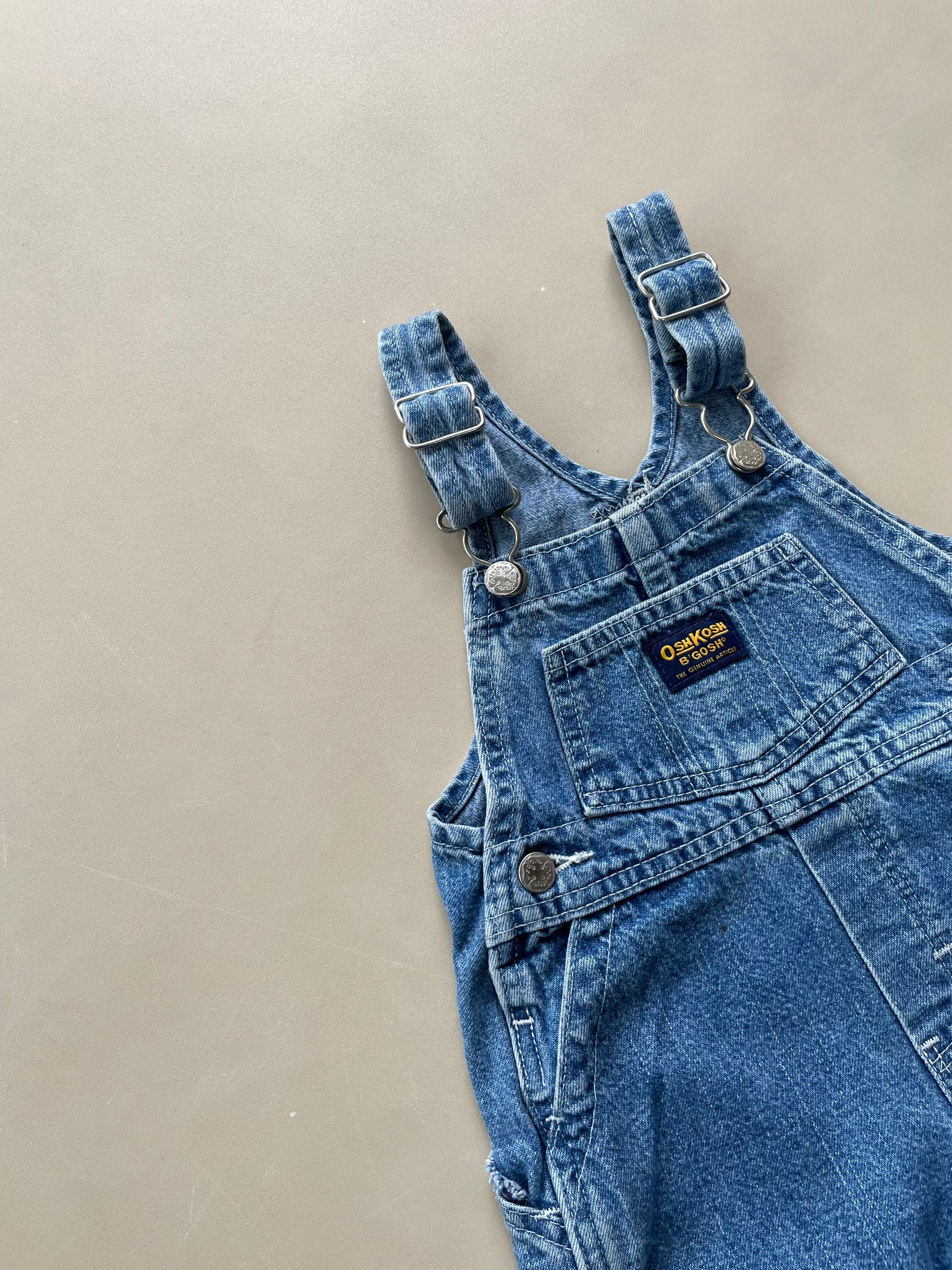 A classic pair of vintage denim overalls from Oshkosh, with Oshkosh branding in front and on back.