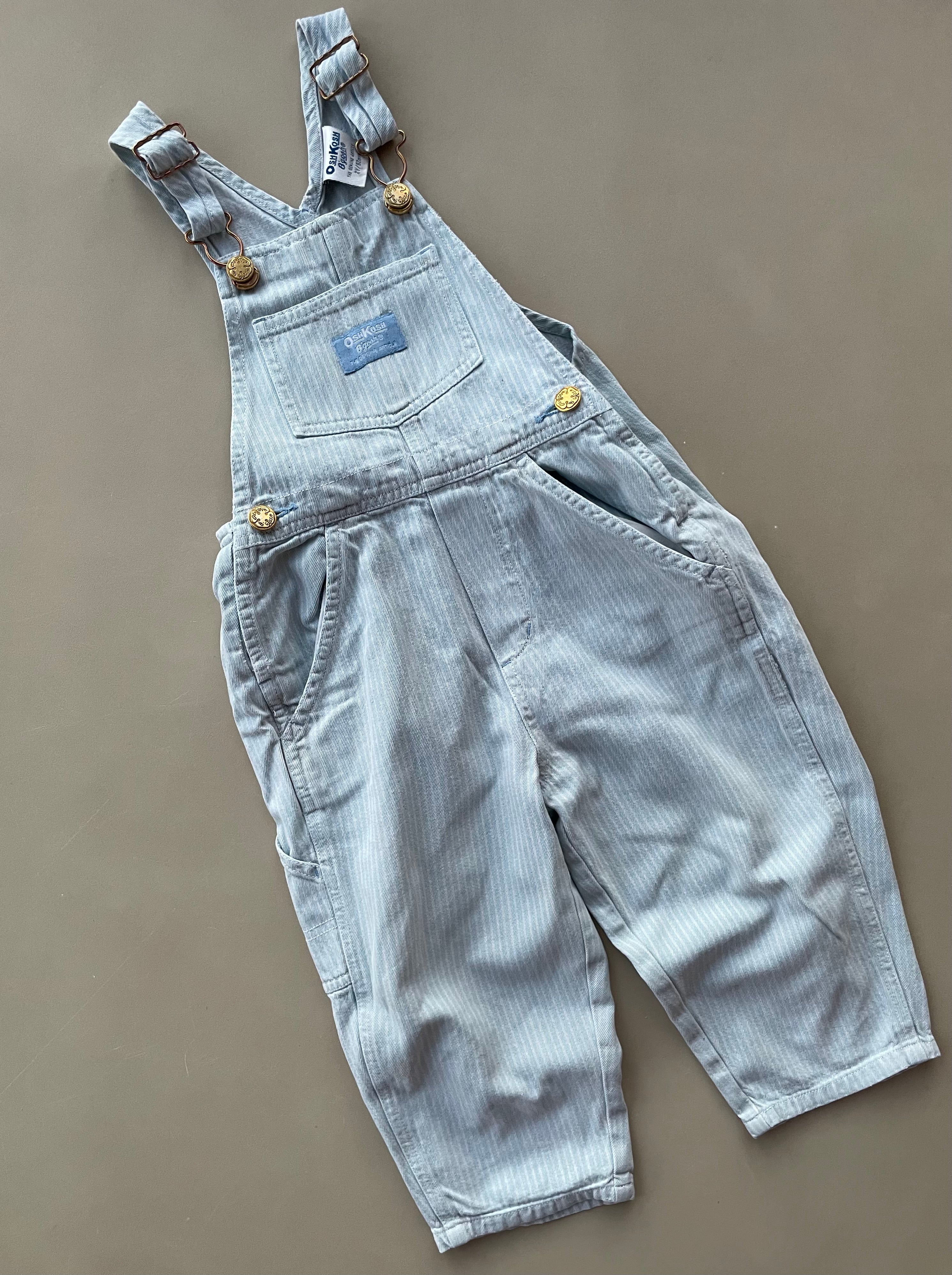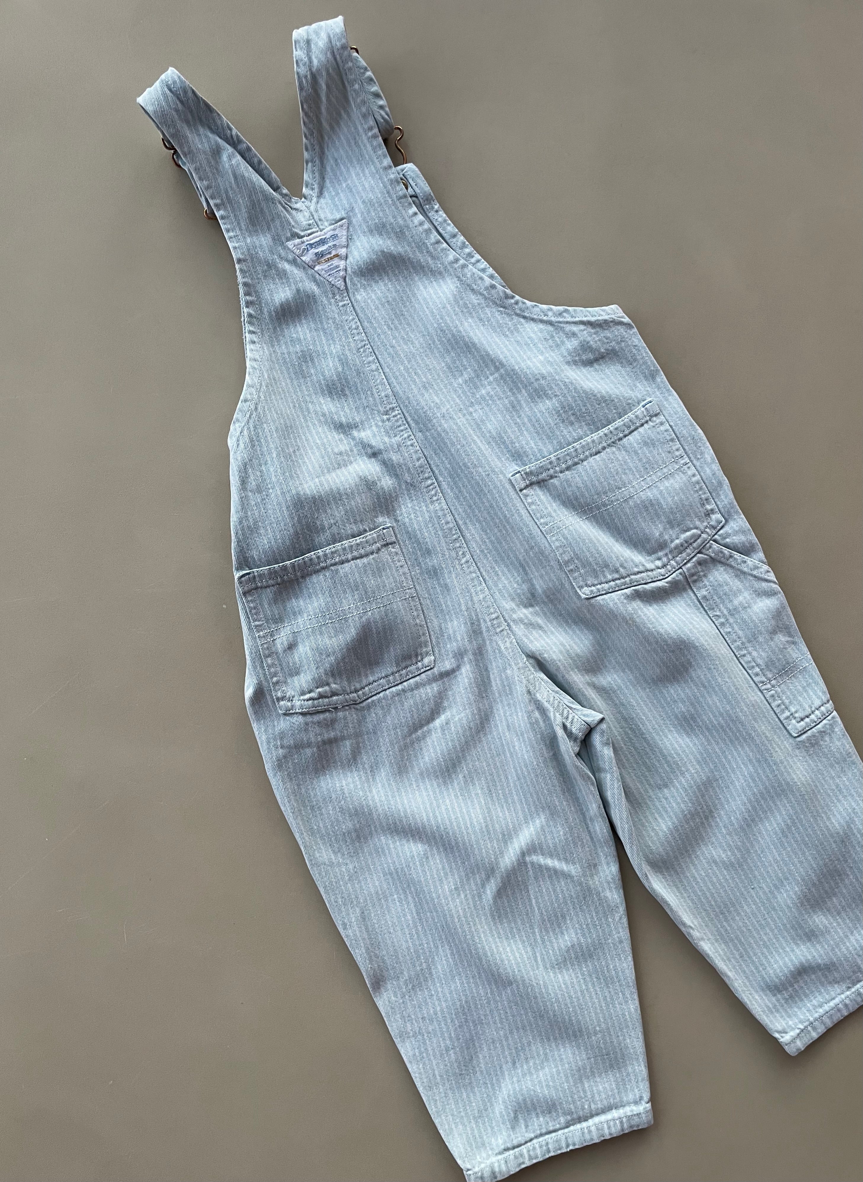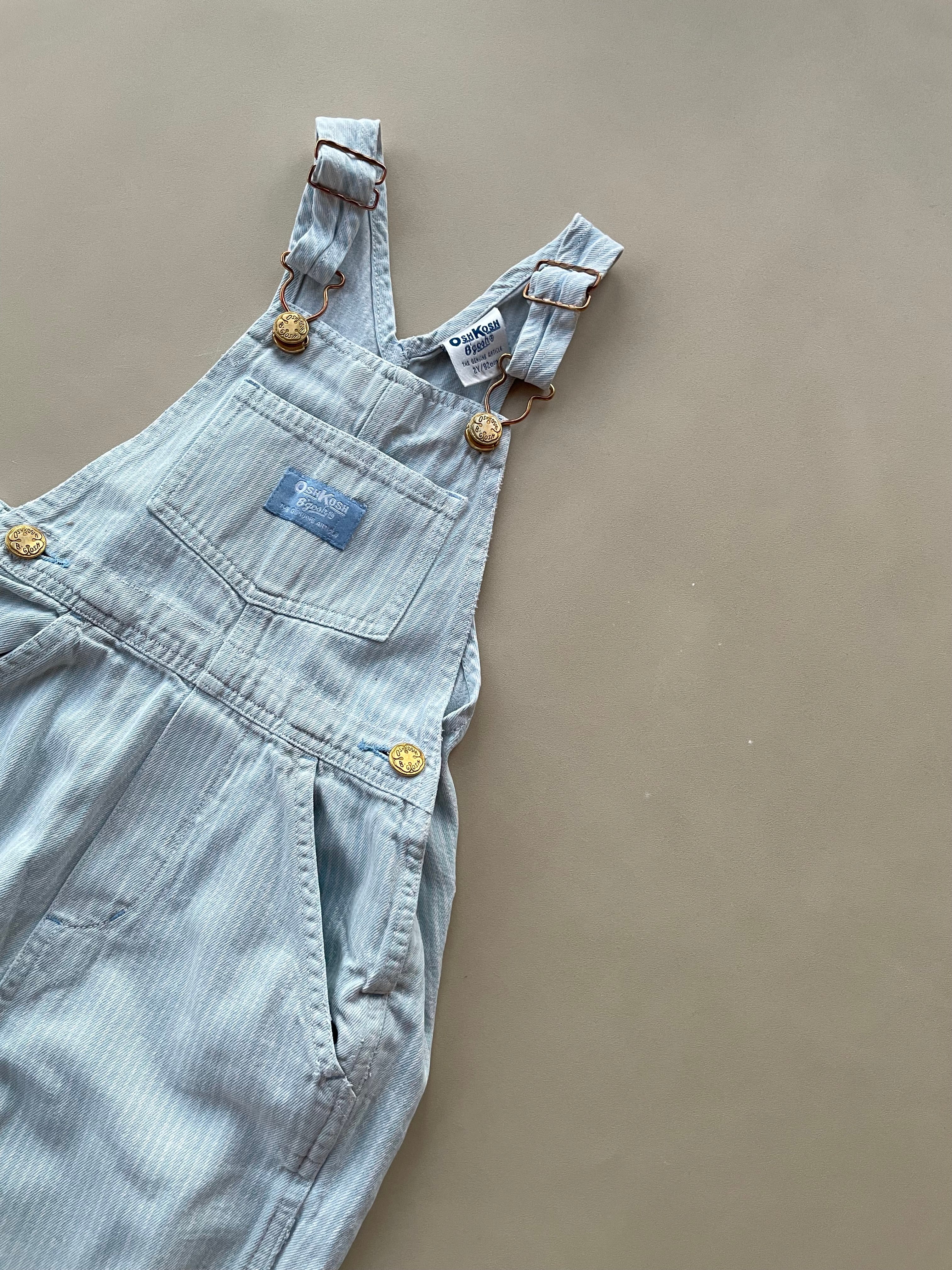 A classic pair of vintage light blue/white hickory striped overalls from Oshkosh, with Oshkosh branding in front and on back. Size on tag is 2 years/92 cm.