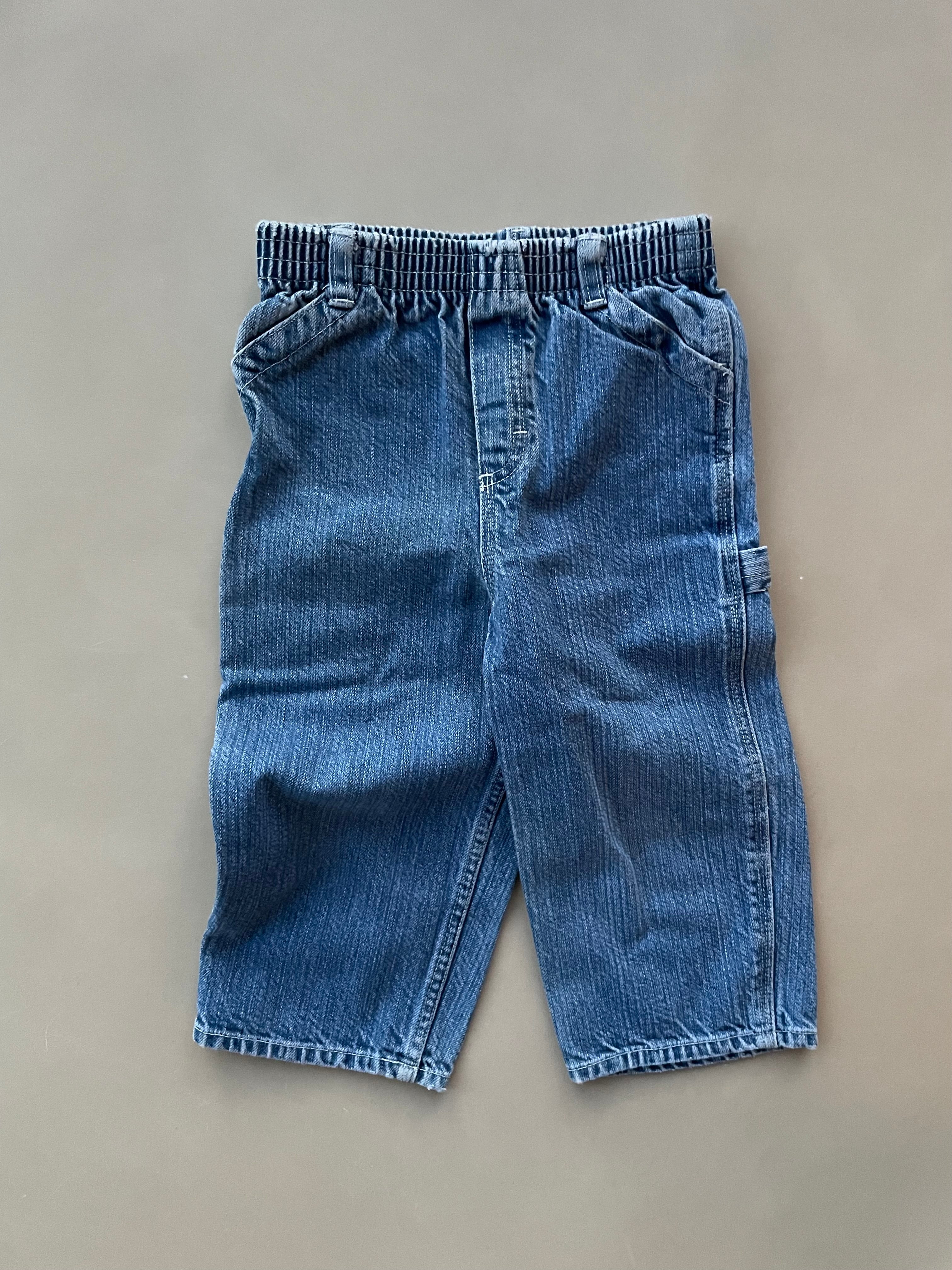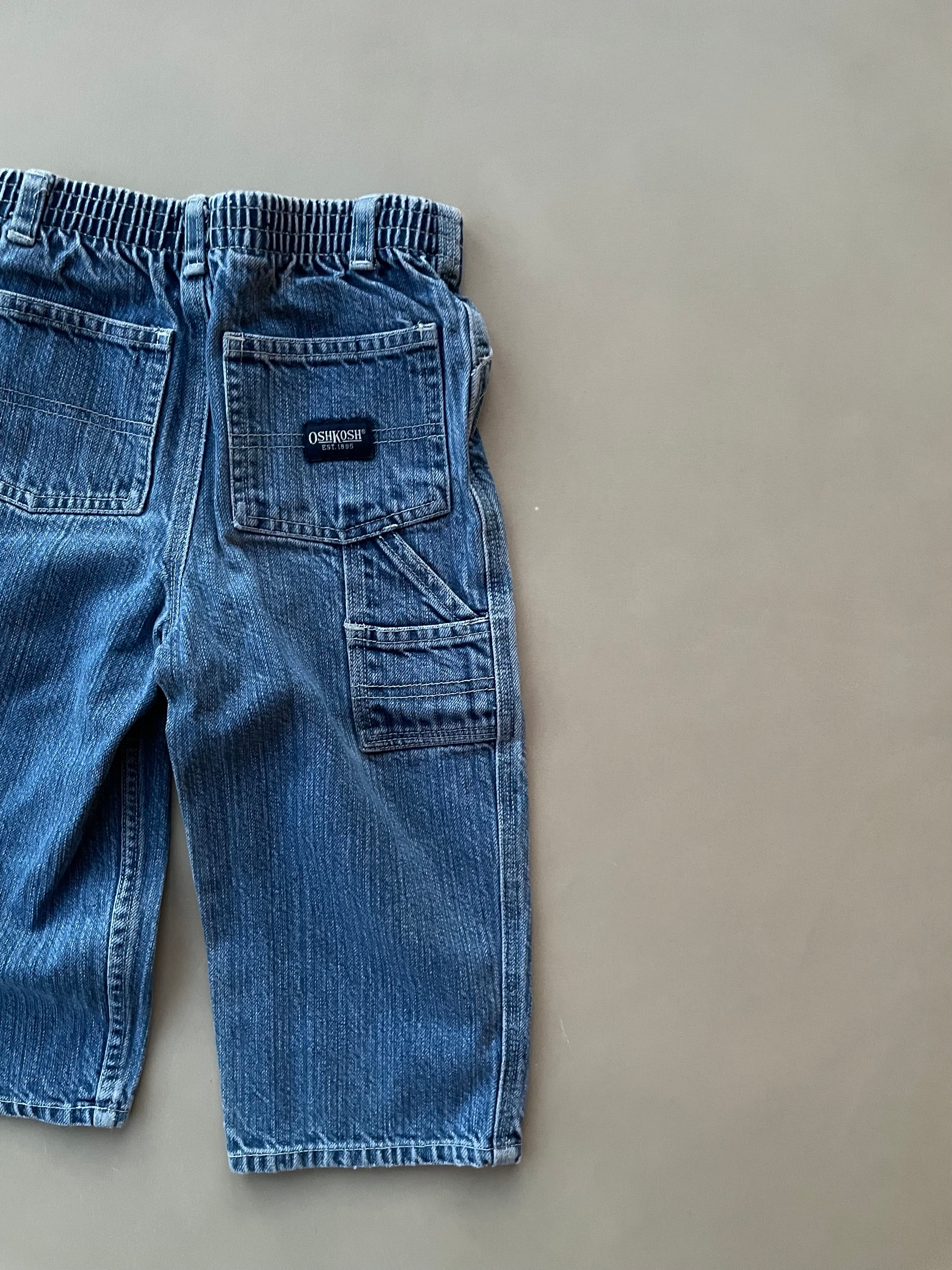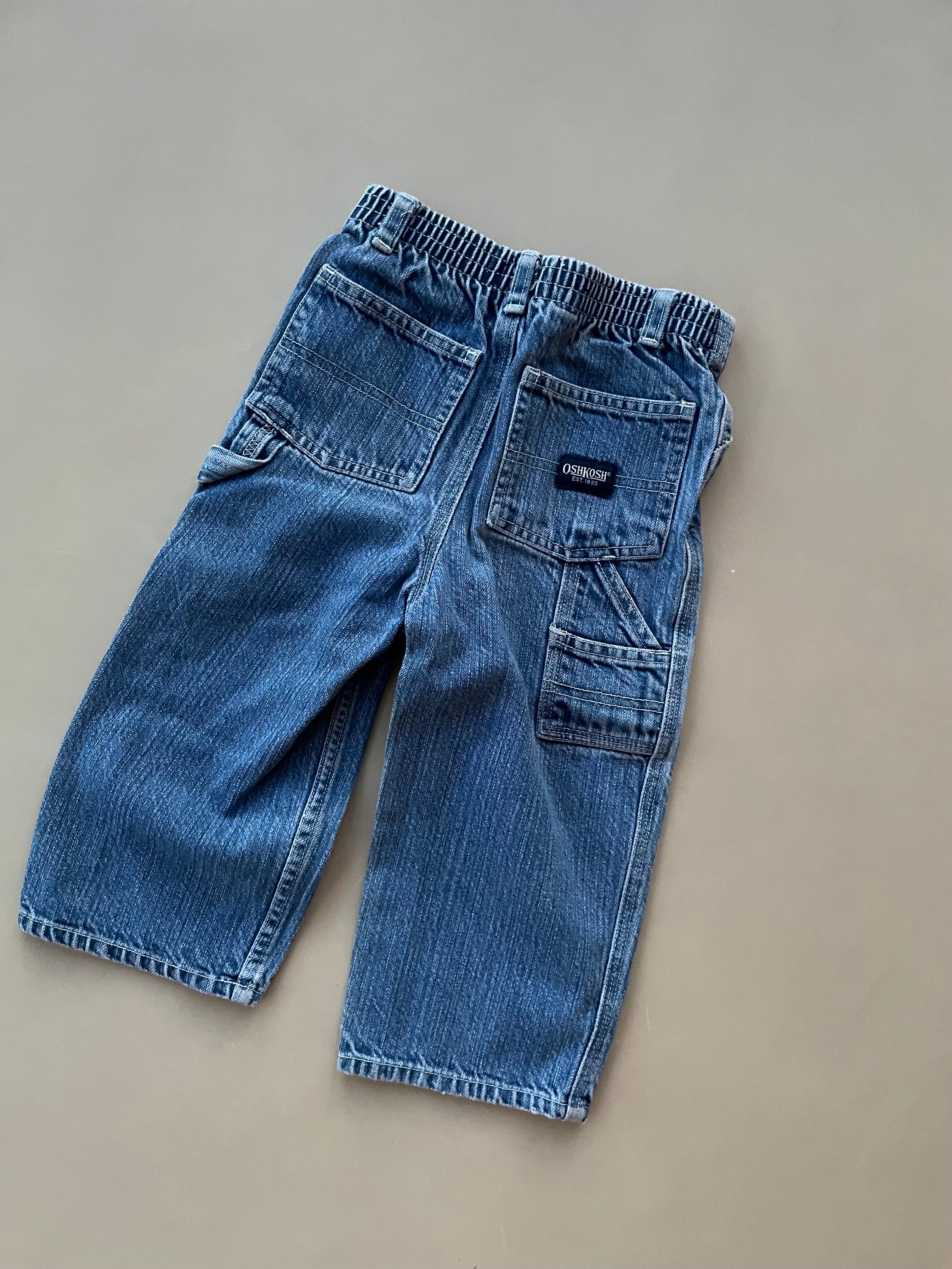 A pair of loose fitted Oshkosh jeans with elastic waist.