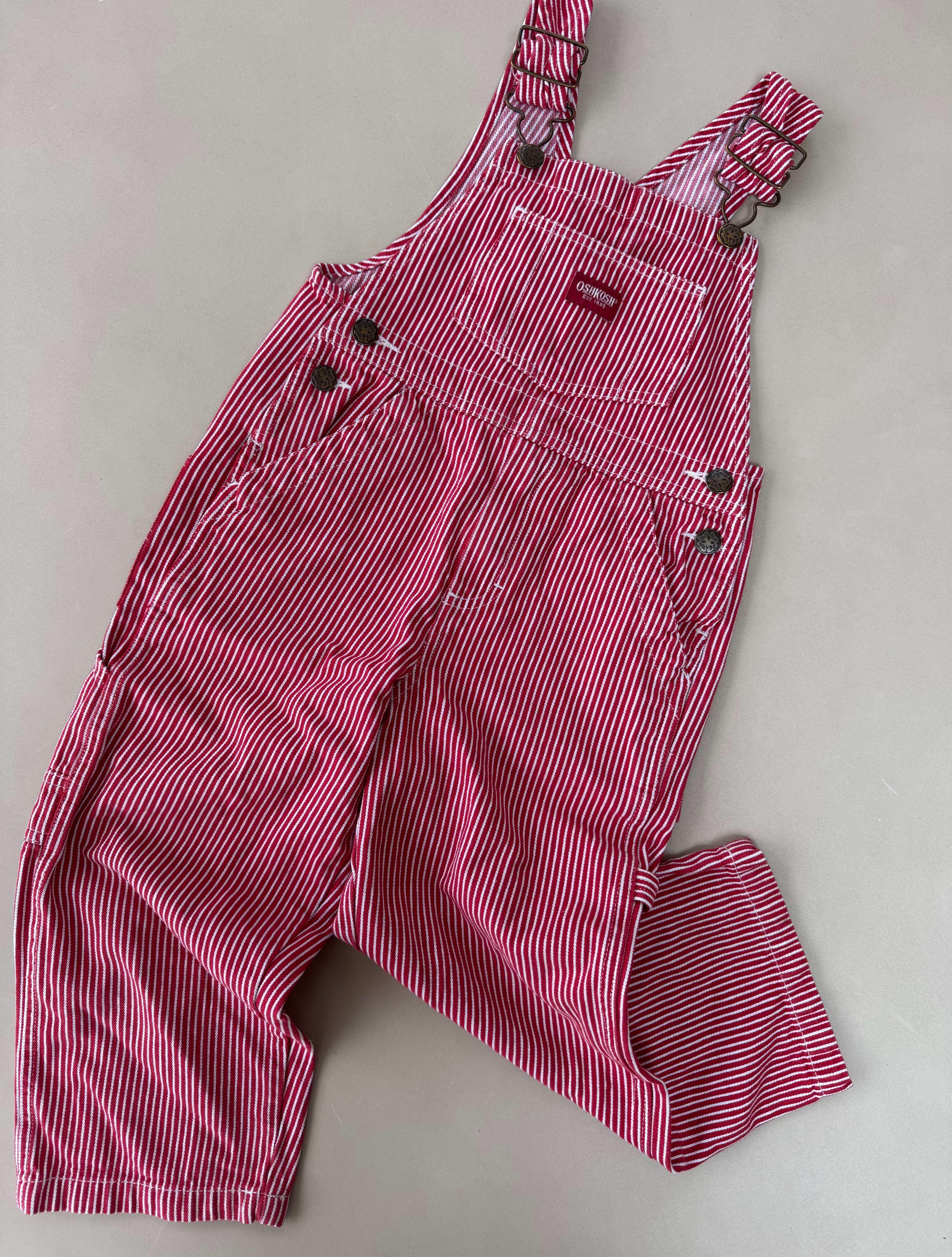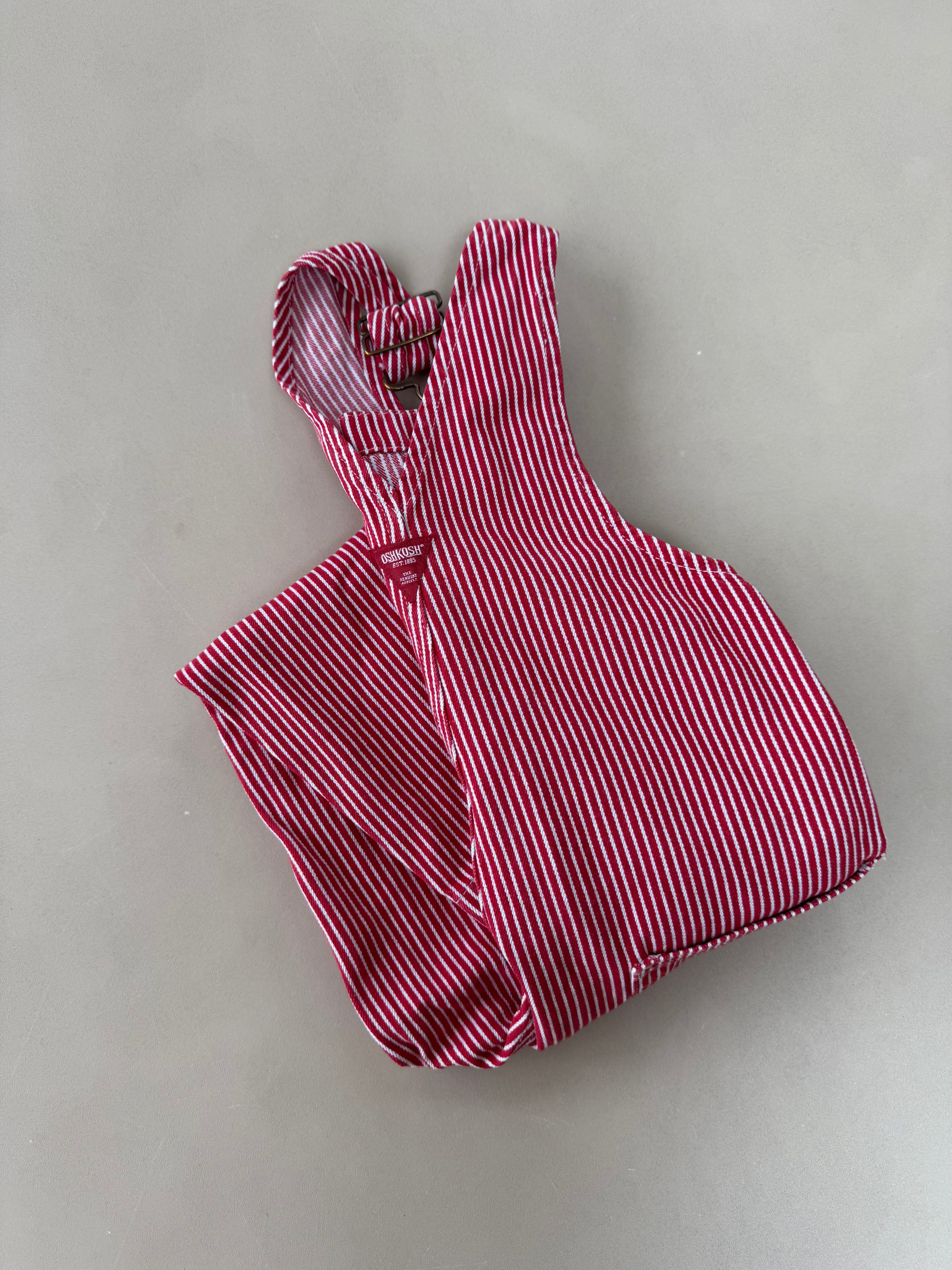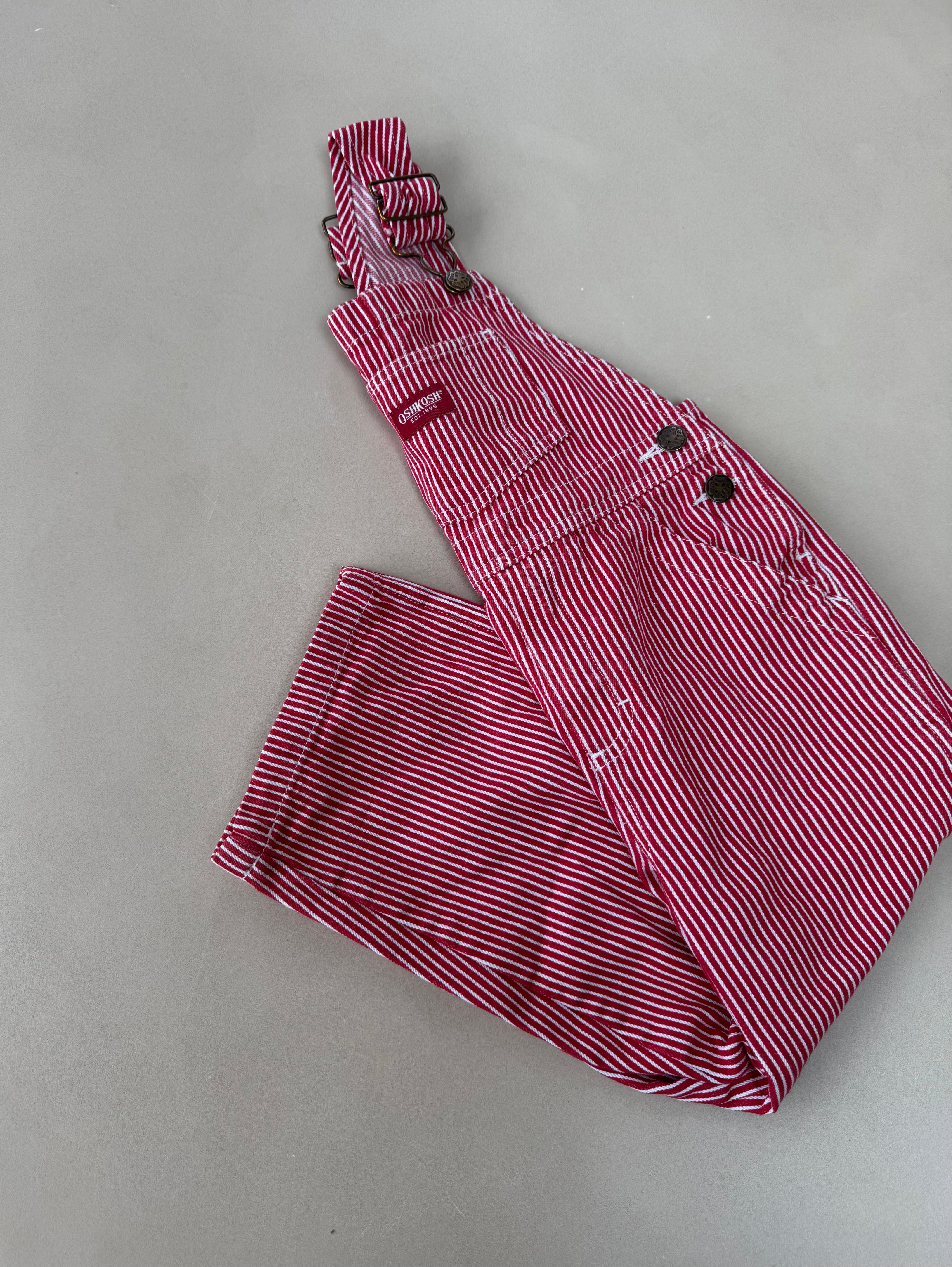 A classic pair of vintage red/white hickory striped overalls from Oshkosh, with Oshkosh branding in front and on back. Size on tag is 4 years/104 cm.