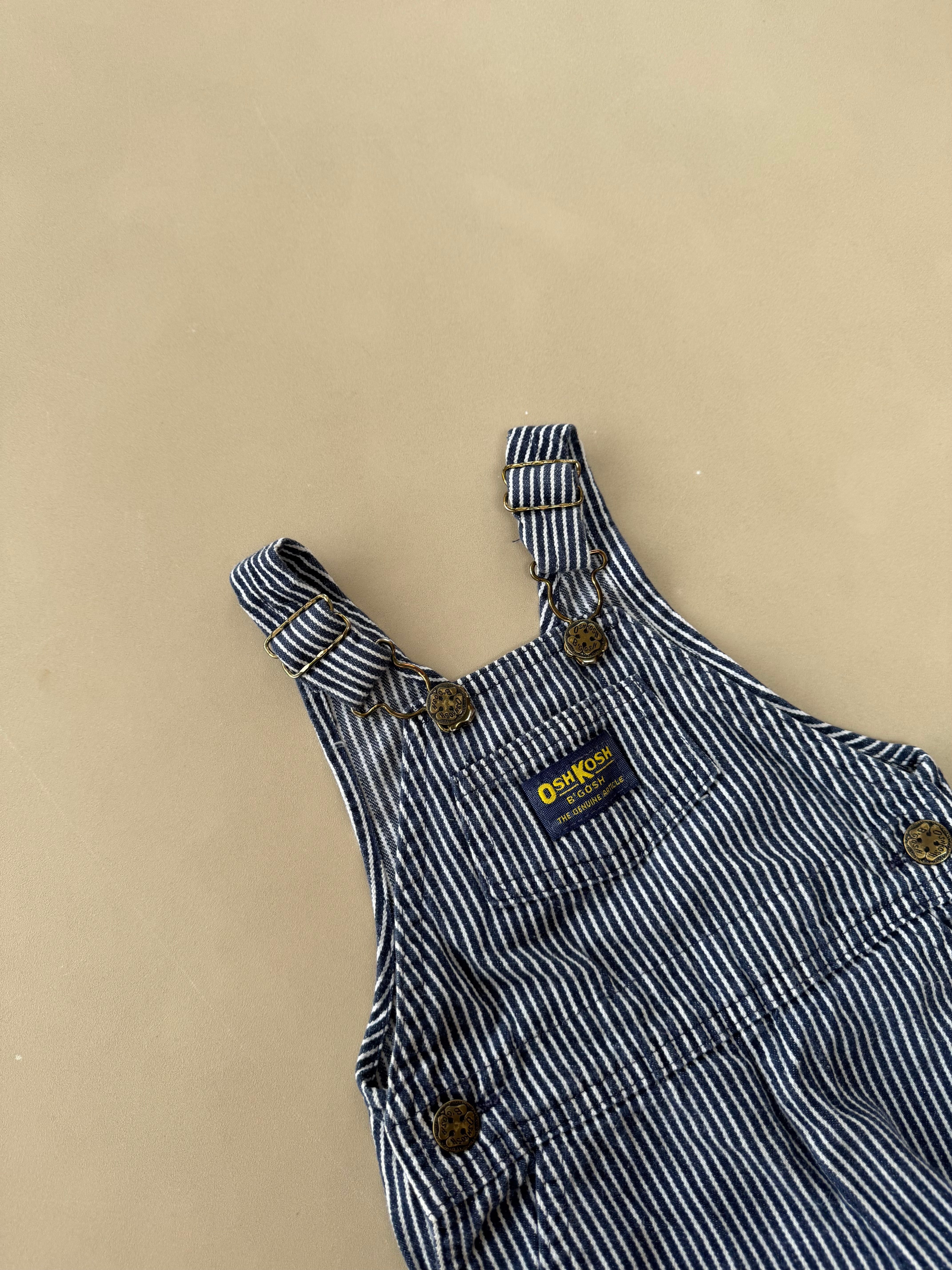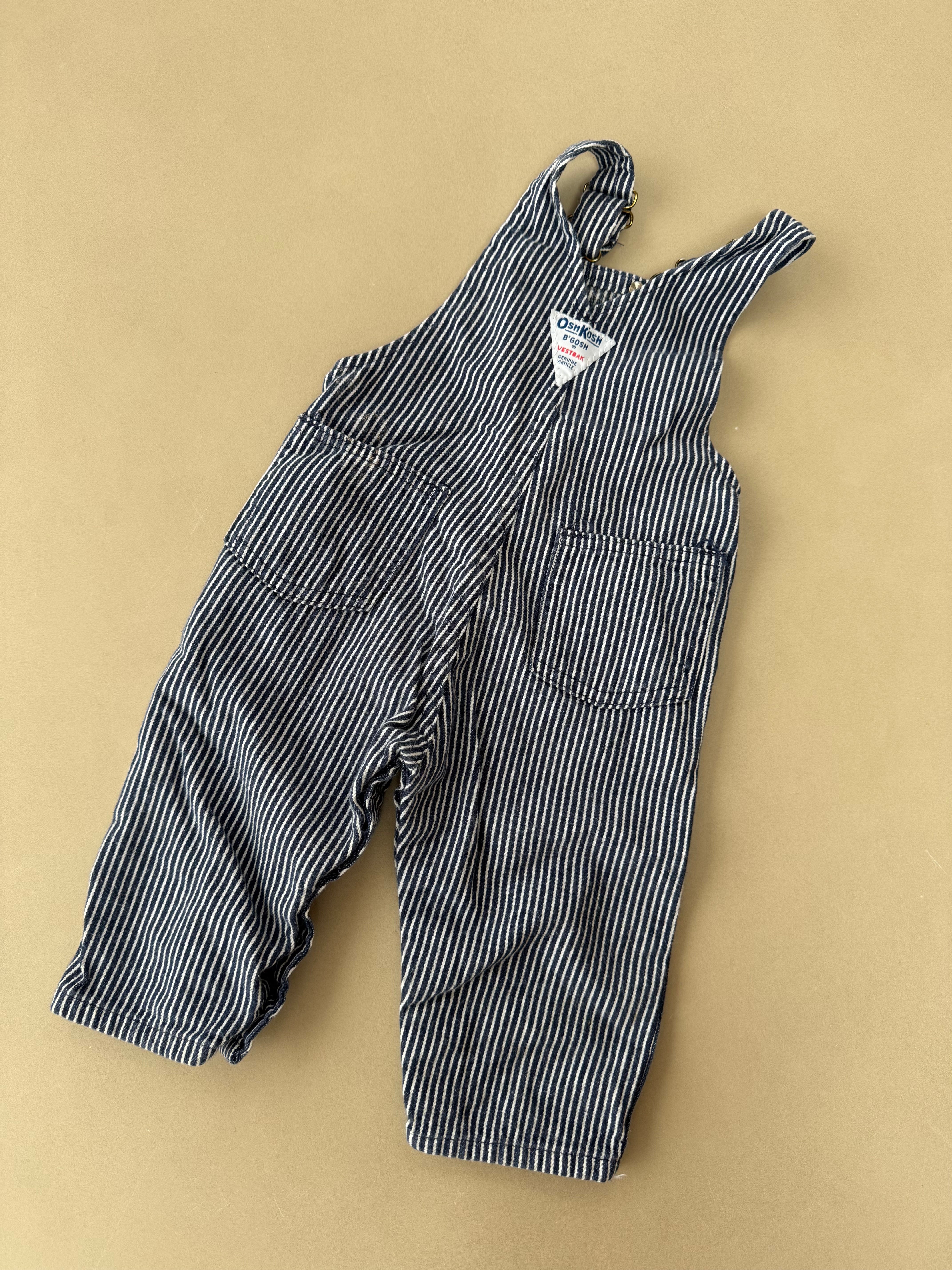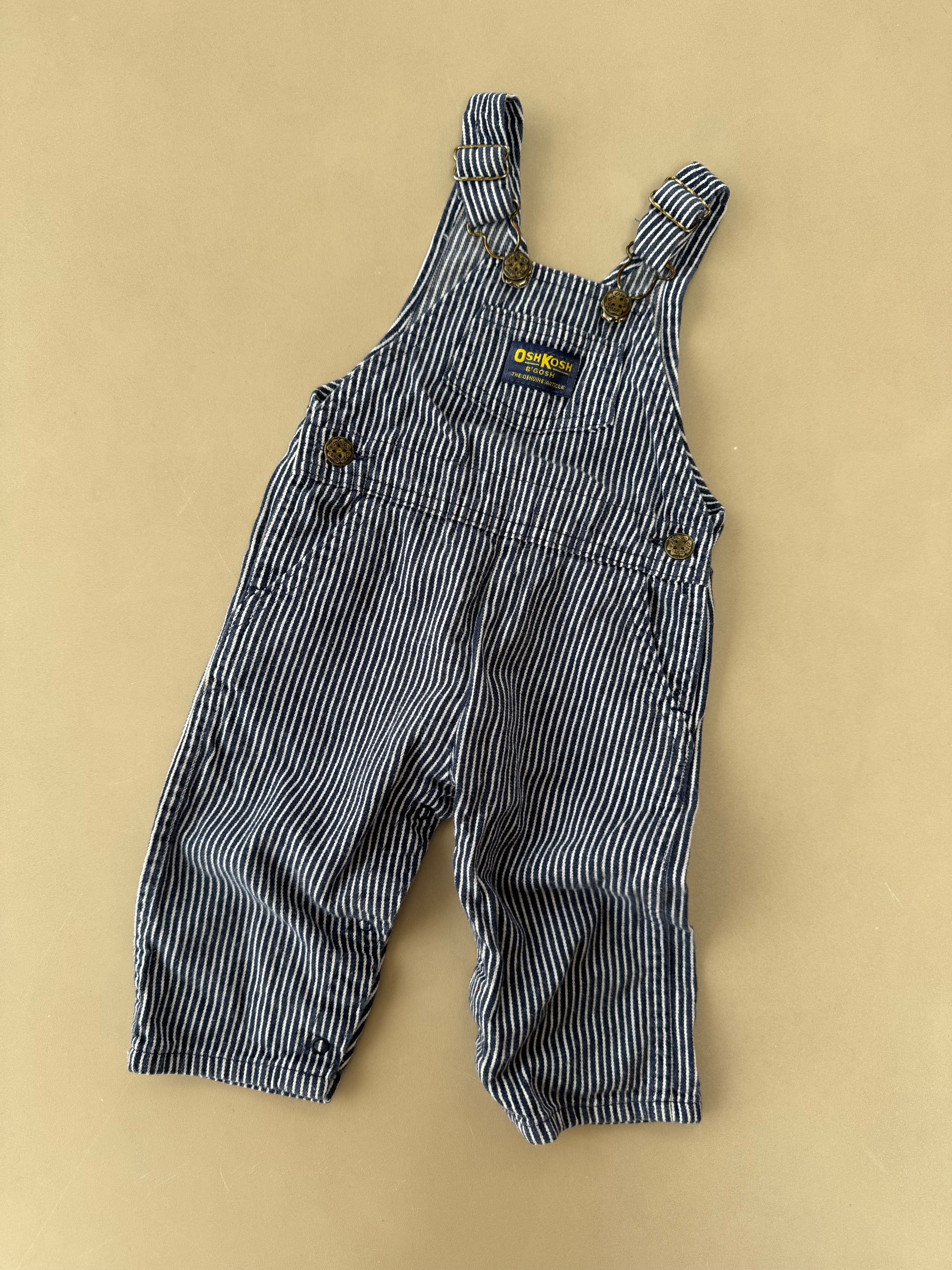 A classic pair of vintage blue/white hickory striped overalls from Oshkosh, with Oshkosh branding in front and on back. Size on tag is 18 months, but they are small in size.